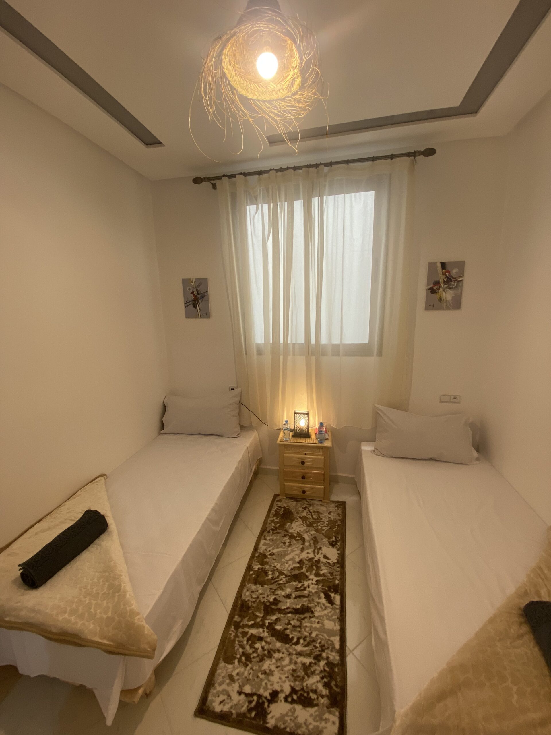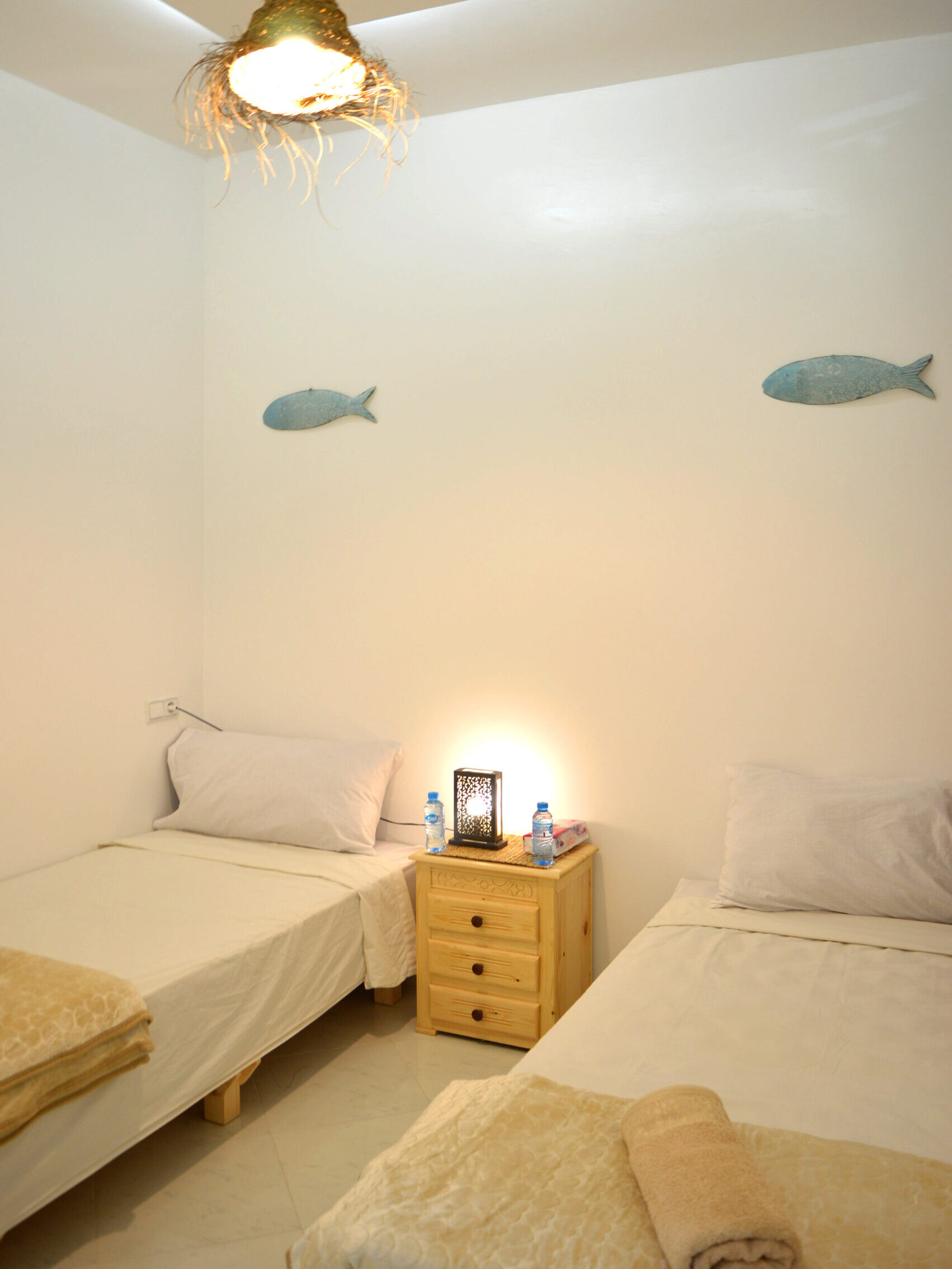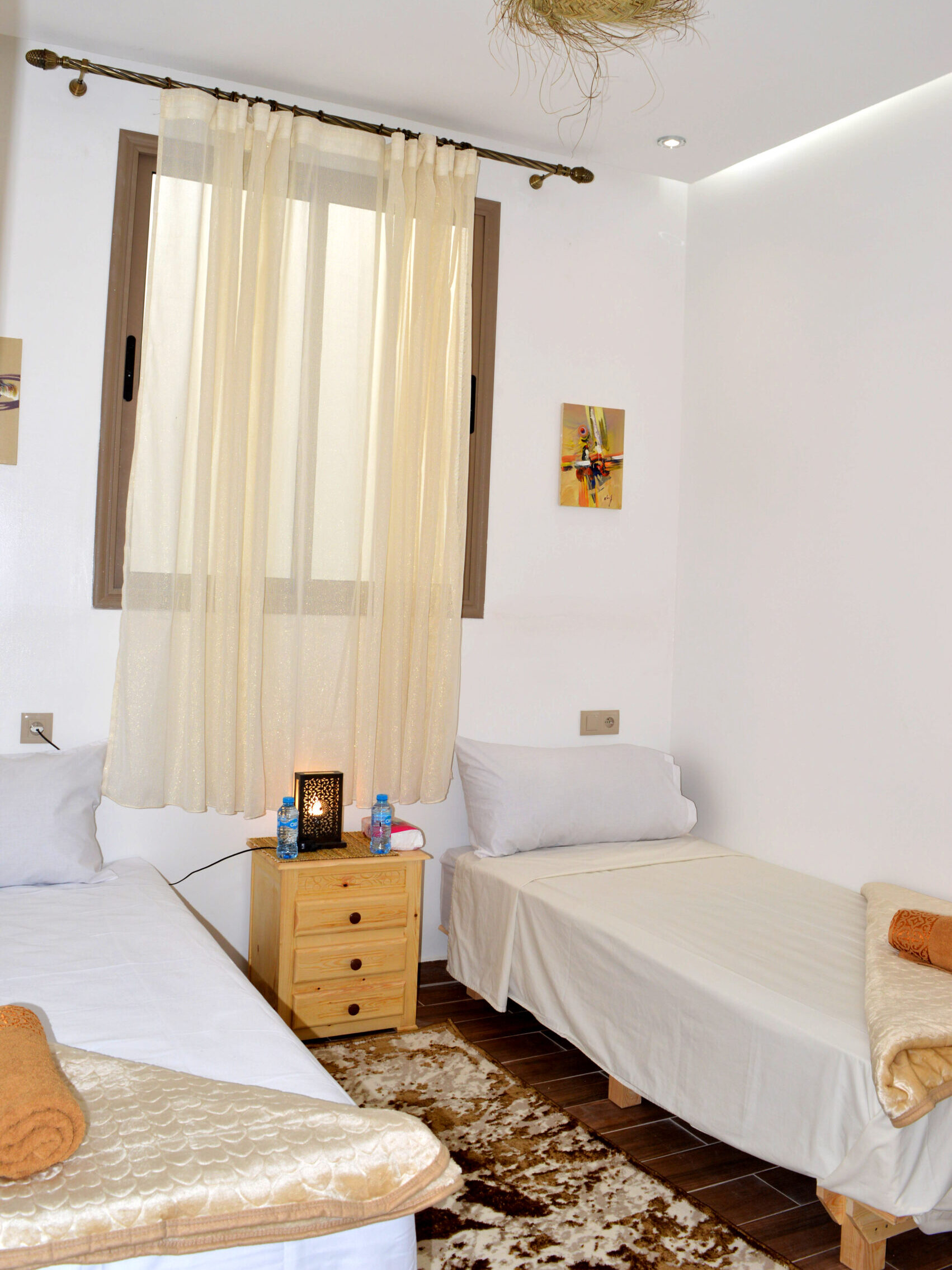 Twin rooms, designed for friends or family, include two comfortable beds, ocean views, a tranquil atmosphere, and a charming Moroccan decor with modern amenities.